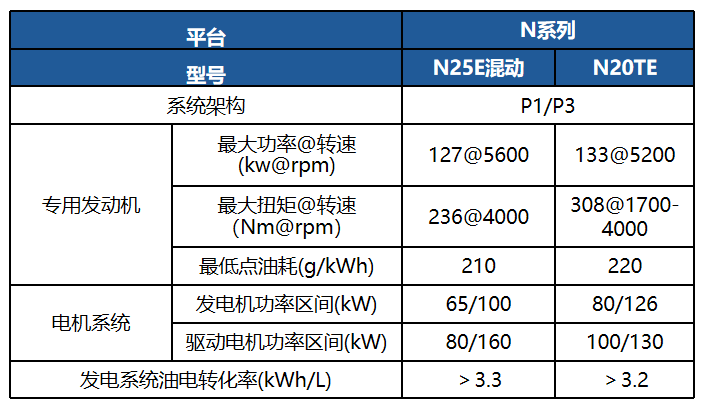 基于N系列發動機開發的適配增程混動車型,最大輸出功率130kW;適用于B級轎車、中大型SUV、皮卡等車型。技術特點